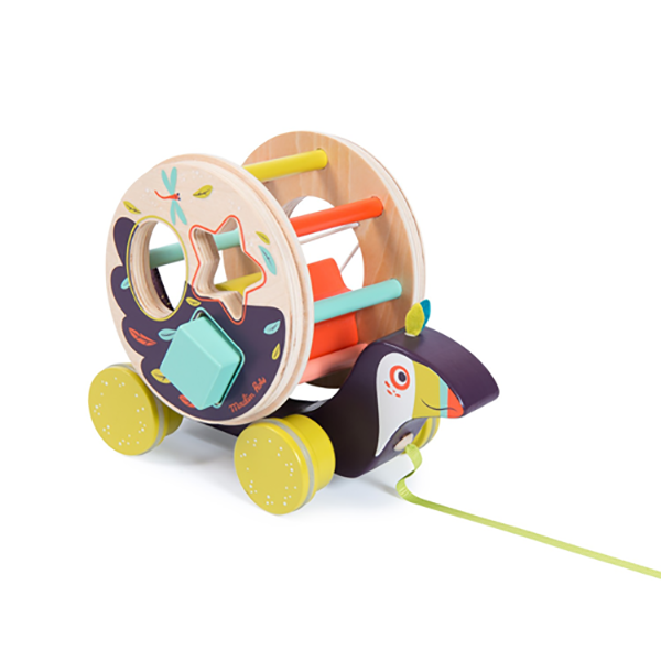 Scatola delle forme trainabile. Il gioco combina la classica scatola delle forme, dove i bambini devono inserire la forma geometrica nel foro corretto, alla dinamicitá del gioco trainabile su ruote. Il tucano in legno ha un corpo variopinto, con il lungo becco giallo e rosso e blu, le ruote gialle e le piume variopinte dipinte. Sulla schiena trasporta la scatola delle forme, un cilindro composto da due cerchi tenuti insieme da sottili asticelle colorate, in modo che il bambino possa vedere le forme geometriche rotolare l’una sull’altra mentre trascina il tucano. La scatola ha tre fori: stella, quadrato e cerchio. Si possono inserire tre formine in legno spesso: la stella rosa a pois bianchi, il cubo azzurro e il cerchio dipinto come un pulcino piumato. Il tucano misura 22,5 x 10,5 x 16 cm. Adatto a bambini dai 10 mesi.